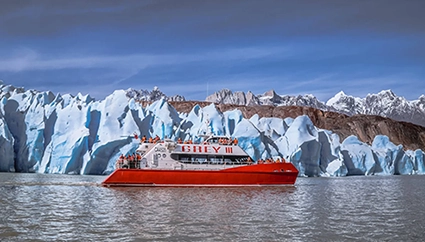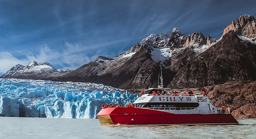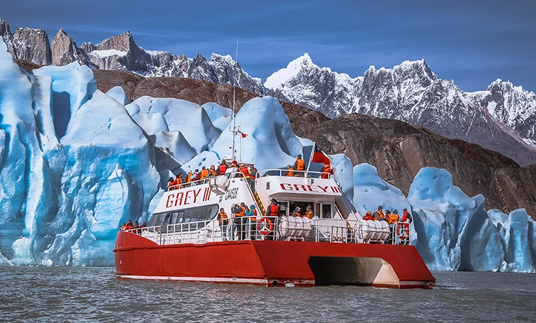 Otra excursión destacada dentro del Parque Nacional Torres del Paine. Se navega en catamarán por el Lago Grey, entre témpanos flotantes.